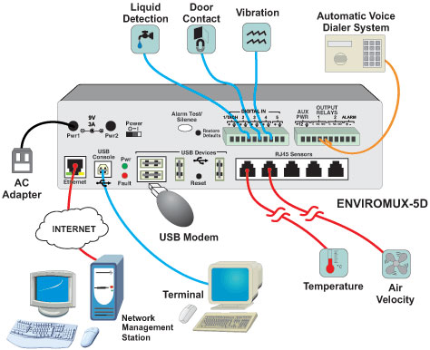 Our Environment Monitoring System monitors critical environmental conditions, such as temperature, humidity, liquid water presence, power, intrusion, and smoke. When a sensor goes out of range of a configurable threshold, the system will notify you via email, LEDs, alarm beacon, siren, web page, network management (SNMP), voice phone calls (via Automatic Voice Dialer System), and SMS messages (via external USB 3G modem).